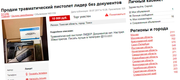 Правильное действие: Увидев, что кто-то хочет отправить травмат или охотничье оружие Почтой или курьерскими службами, закройте объявление, нажав перед этим кнопку "Пожаловаться модератору".